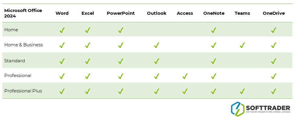 Pro Office 2024 jsou k dispozici různé licence Microsoft Office, včetně variant Home, Home & Business, Professional a Professional Plus. Následuje přehled aplikací, které jsou součástí jednotlivých balíčků: